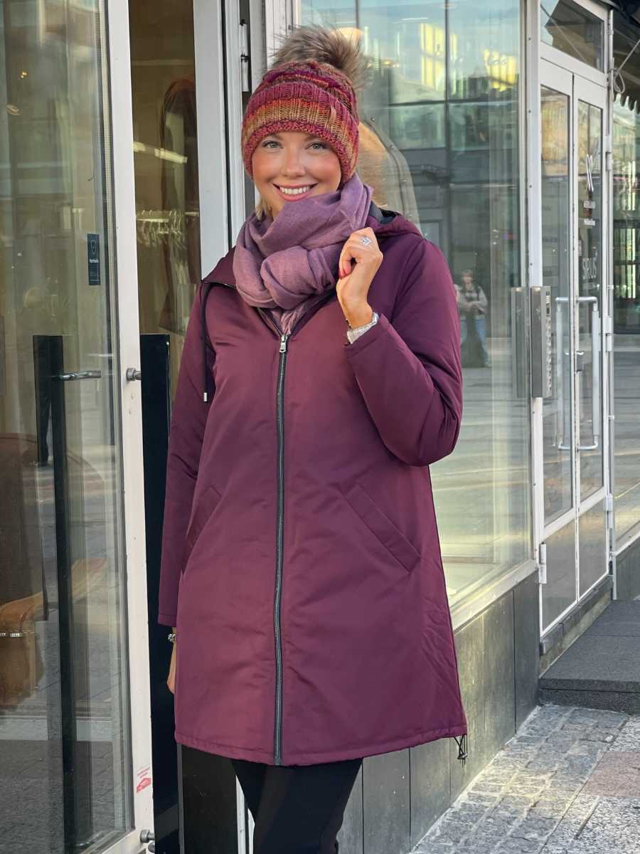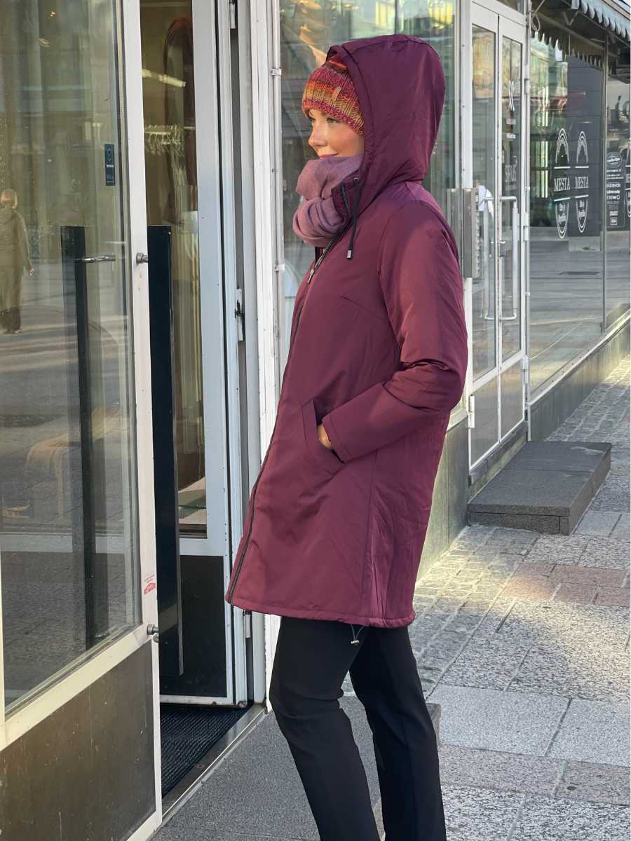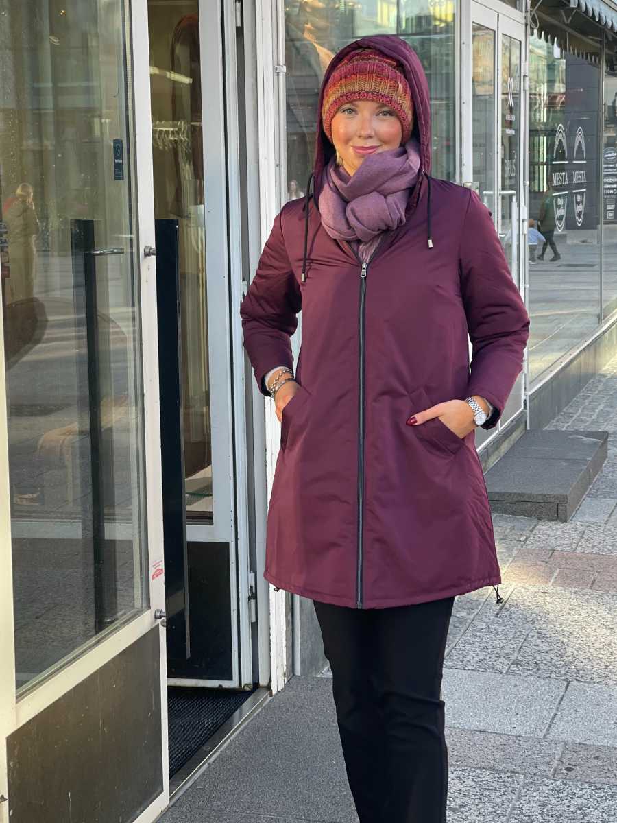 Helma kiristettävissä kuminauhalla, sivuilla taskut, resorihihat