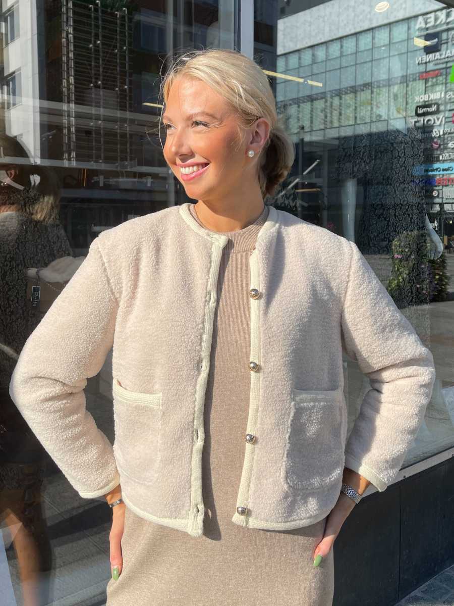 Ihanan pehmeä ja lämmin takkijakku, jossa on vuori mukavuuden ja ryhdin tueksi. Pyöreä pääntie, nappikiinnitys edessä ja kaksi etutaskua tekevät mallista sekä käytännöllisen että tyylikkään. Sopii täydellisesti rennoksi arkitakiksi farkkujen tai suorien housujen kanssa – ja toimii mainiosti myös sisäkäytössä neuletakin tapaan.