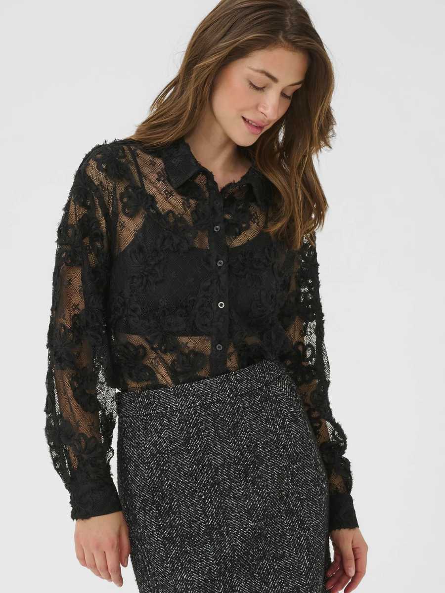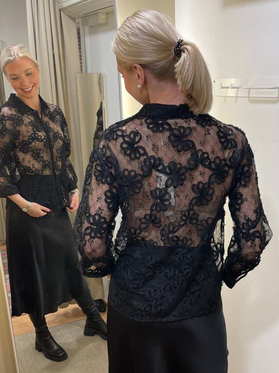 Tämä upea musta pitsipusero hurmaa rohkealla ja romanttisella ilmeellään. Kukkakuvioinen pitsi ja läpikuultava materiaali luovat ylellisen ja naisellisen vaikutelman. Klassinen kaulus ja nappikiinnitys edessä tasapainottavat lookin hienostuneella tavalla.