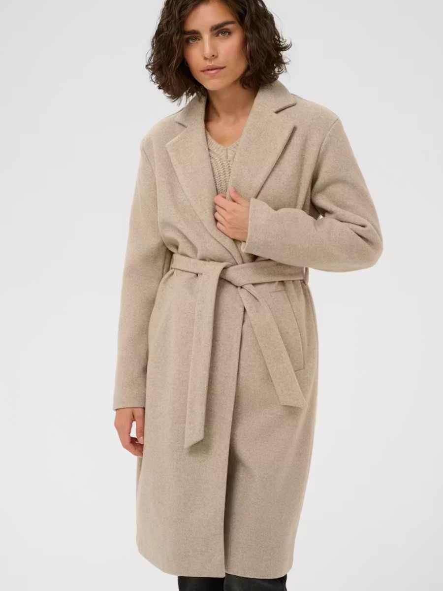 Vuorittomuus tekee takista kevyen ja miellyttävän käyttää kerrospukeutumisessa. Pehmeäpintainen polyesterimateriaali laskeutuu kauniisti ja tuntuu mukavalta päällä. Irrotettava vyö korostaa vyötäröä ja antaa mahdollisuuden muokata siluettia rennommaksi tai ryhdikkäämmäksi. Sivuilla taskut