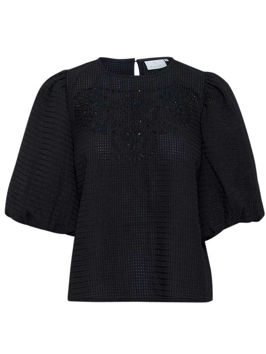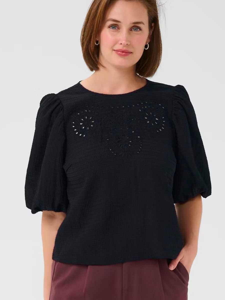 Melani-pusero on täydellinen valinta, kun haluat yhdistää klassisen tyylin ja mukavuuden. Kauniit kyynärpituudet pussihihat ja hienovaraisesti teksturoitu kangas tuovat asuun eleganttia ilmettä. Etuosan herkät kirjontaleikkaukset lisäävät puseroon naisellista yksityiskohtaa, ja niskan nappikiinnitys viimeistelee lookin.