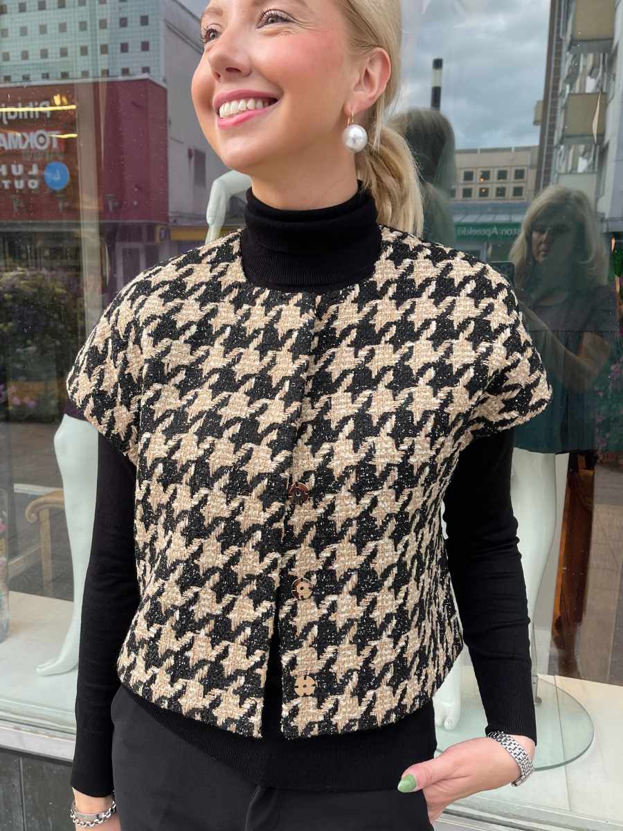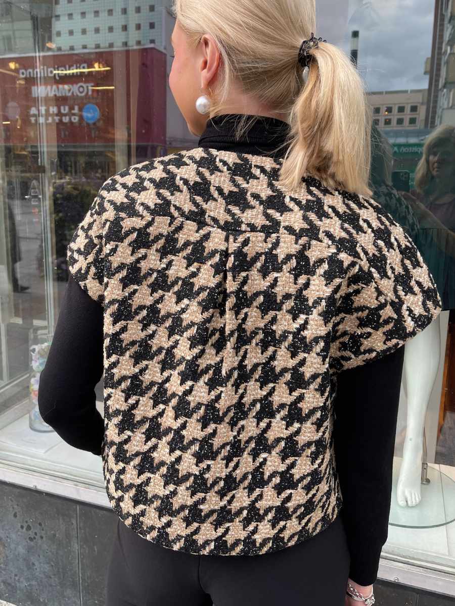 Tämä upea liivi tuo tyyliisi ripauksen ajattomuutta ja eleganssia. Mustan ja beigen sävyinen kuvio tekee asusta näyttävän, mutta helposti yhdisteltävän. Liivi on napitettava edestä ja sen lyhyt, laatikkomainen malli istuu kauniisti monenlaisten asujen kanssa.