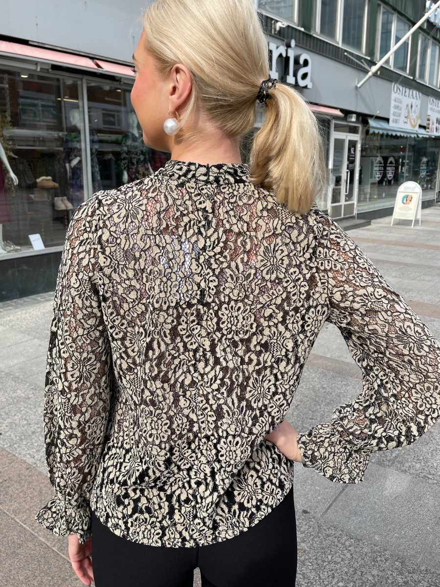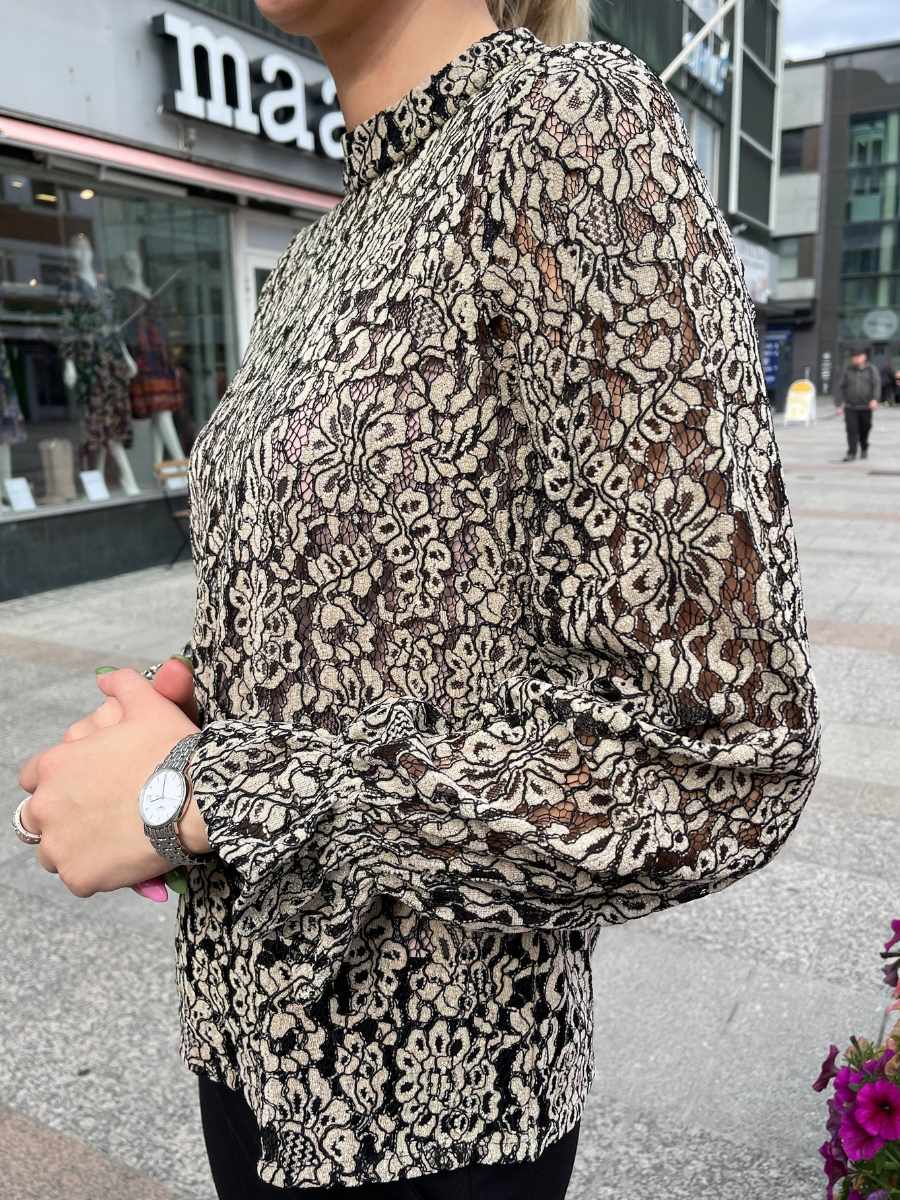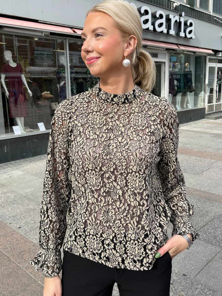 Kaunis pitsipaita joustavasta materiaalista. Tyylikäs pystykaulus ja selän vetoketjukiinnitys tuovat asuun viimeistellyn ilmeen. Hihansuissa on joustavat kuminauhat ja romanttiset röyhelöyksityiskohdat.