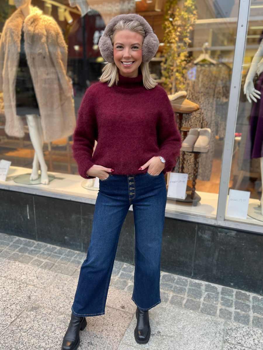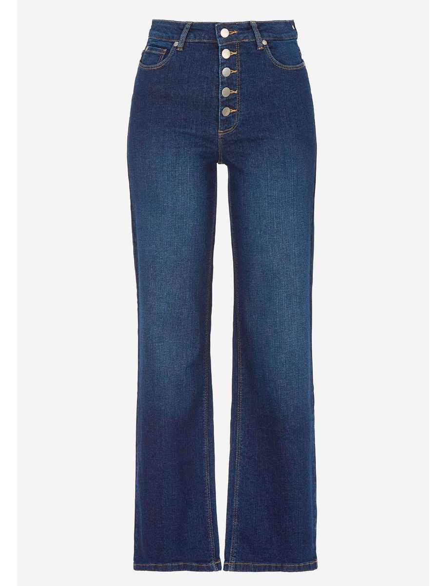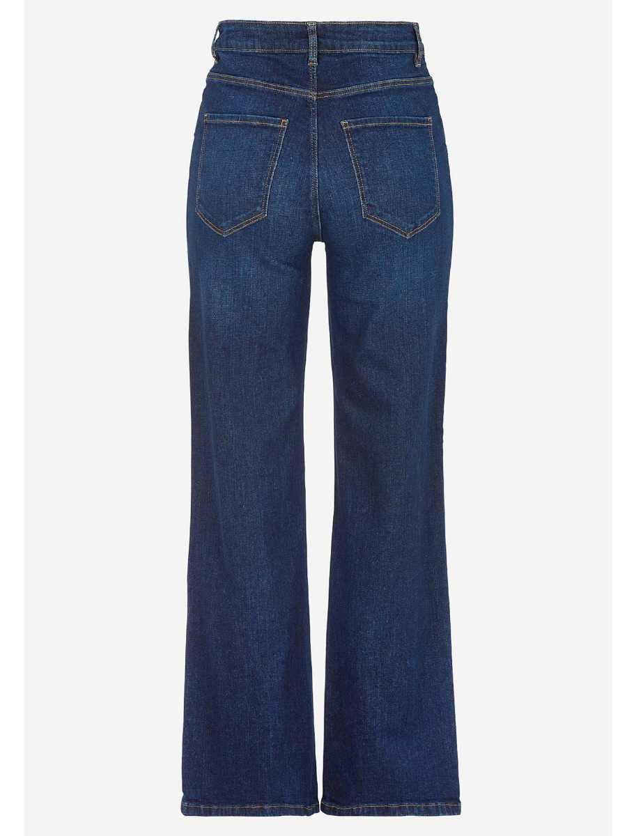 Tyylikkäät 5-taskuiset farkut, joissa on mukava jousto ja korkea vyötärö. Suora malli ja hieman leveämmät lahkeet luovat ajattoman ja imartelevan siluetin. Näkyvä nappisepalus ja vyötärönauha vyönlenkeillä viimeistelevät klassisen ilmeen. Lahkeen sisäpituus on noin 78 cm kaikissa ko’oissa, ja haaran korkeus vaihtelee koon mukaan noin 26–35 cm.